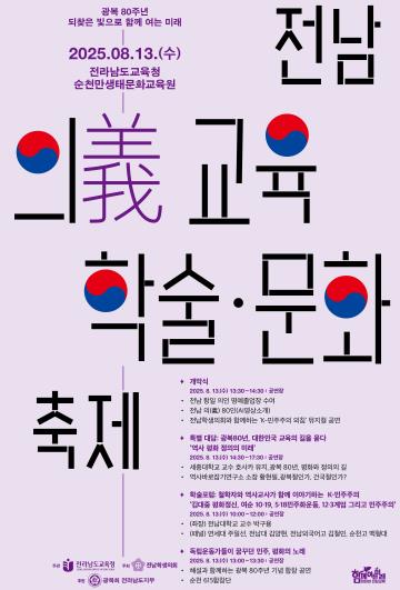 [무한뉴스=정민정 기자] 전라남도교육청은 13~14일 순천만생태문화교육원에서 ‘광복 80주년 되찾은 빛으로 함께 여는 미래’를 주제로 전남 의(義)교육 학술·문화 축제를 개최한다.