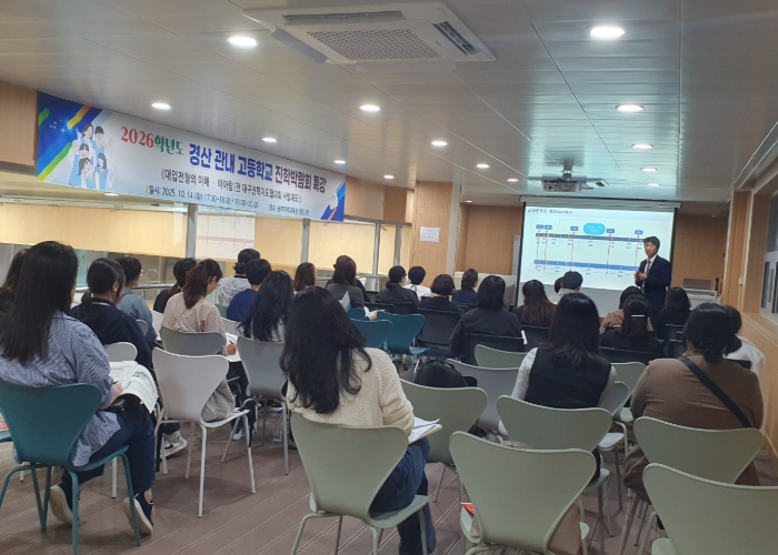 [무한뉴스=최진수 기자] 경상북도경산교육지원청은 2025년 10월 14일 남부미래교육관에서 ‘2026학년도 경산 관내 고등학교 진학박람회’를 성황리에 개최했다. 이번 행사에는 중학교 3학년 학생과 학부모 등 200여 명이 참석해 높은 관심을 보였다.