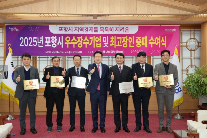 [무한뉴스=최진수 기자] 포항시는 23일 시청 대외협력실에서 ‘2025년 포항시 우수장수기업 및 최고장인 증패수여식’을 개최했다.