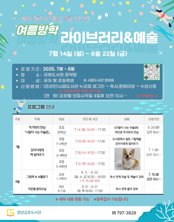 김현숙 도서관과장(직무대리)은 “이번 여름방학 프로그램은 어린이들이 책을 중심으로 다양한 예술 활동을 경험하며 도서관을 보다 친숙하게 느끼는 계기가 될 것”이라며, “책과 문화가 어우러진 도서관 공간에서 풍성한 방학을 보내시길 바란다”고 말했다.