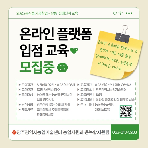 [무한뉴스=정민정 기자] 광주광역시 농업기술센터는 농식품 및 농산물의 온라인 유통채널 입점을 위한 ‘2025년 온라인 플랫폼 입점 교육’을 오는 8월18일부터 9월1일까지 센터 스마트농업교육관에서 진행한다.