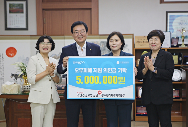 [무한뉴스=정민정 기자] 국민건강보험공단 광주전라제주지역본부는 최근 집중호우로 큰 피해를 입은 지역 주민들의 조속한 일상 회복을 돕기 위해 광주광역시 북구와 전라남도 담양군, 나주시, 함평군, 무안군에 각 500만원씩 총 2,500만원의 피해복구 성금을 기탁했다.