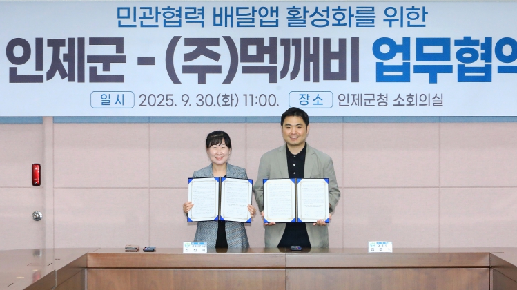 [무한뉴스=정민정 기자] 인제군은 9월 30일 군청 소회의실에서 민관협력 배달앱 ‘먹깨비’ 운영사와 업무 협약을 체결하고, 지역 소상공인 경영 안정과 군민 편익 증진을 위한 본격적인 협력에 나섰다.