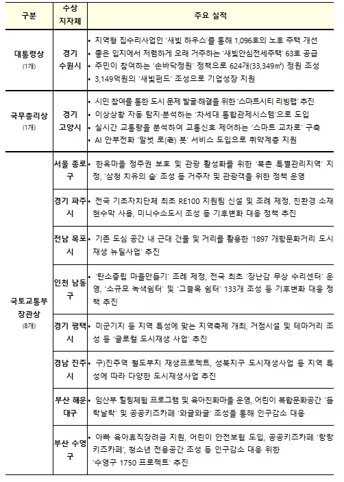 이 외에도 한옥마을의 정주권을 보호하고, 관광 활성화를 위해 ‘북촌 특별관리지역’을 지정한 서울 종로구, 기초자치단체 최초로 ‘RE100 지원팀’을 신설하여 관내 기업의 RE100을 지원한 경기 파주시, 기존 도심 공간 내 근대 건물을 활용한 ‘1897 개항문화거리 도시재생 뉴딜사업’을 추진한 전남 목포시 등 8개 지자체가 국토교통부 장관상을 수상할 예정이다.