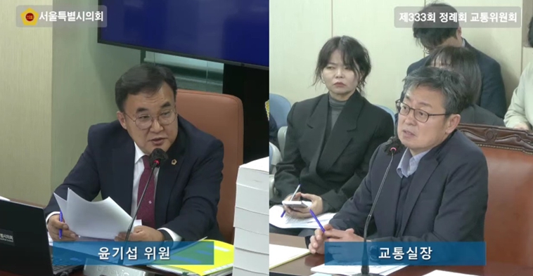 | ▲ 윤기섭 의원(국민의힘·노원5)이 지난 4일 교통위원회 회의실에서 실시된 행정사무감사에서 여장권 교통실장에게 질의를 하고 있다. |