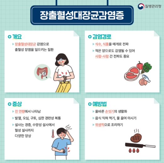 장출혈성대장균 감염증은 주로 덜 익힌 소고기, 오염된 식품·물을 통해 전파되며, 감염 시 복통, 구토, 발열, 설사(혈변 포함) 등의 증상이 나타난다. 대부분은 수일 내 회복되지만, 면역력이 약한 10세 미만의 소아나 고령자는 용혈성요독증후군(HUS) 같은 중증 합병증으로 악화될 가능성이 있어, 각 가정과 어린이집·학교 등 집단생활시설에서의 예방 관리가 무엇보다 중요하다.