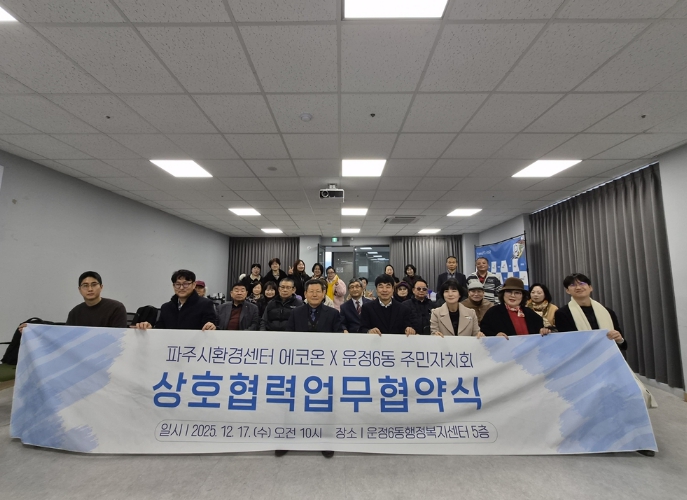 [무한뉴스=정승훈 기자] 운정6동 주민자치회는 12월 17일 오전 10시, 운정6동 행정복지센터에서 파주시환경센터 ‘에코온’과 ‘지역 환경 의제 실천 및 기후행동 협력을 위한 업무협약’을 체결하고, 이어 마을 소식지 '초롱꽃향기로' 2호 제작 성과공유회를 개최했다.