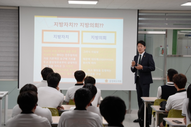 이날 의회교실에는 행정문화위원회 소속 조성태 의원(충주1)이 중앙탑고를 방문해 30여 명의 학생을 대상으로 조례 제정 및 개정, 예산·결산 심의, 행정사무감사 등 도의회의 역할을 설명했다.