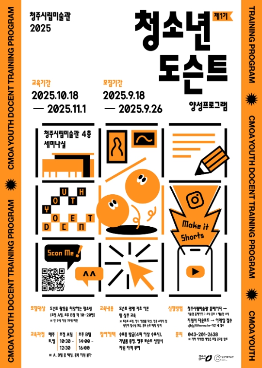 [무한뉴스=정민정 기자] 청주시립미술관은 18일부터 오는 9월 26일까지 ‘제1기 청소년 도슨트 양성 프로그램’ 참가자를 모집한다고 밝혔다.