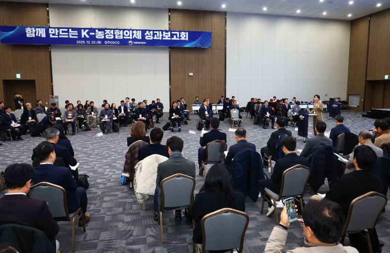 [무한뉴스=최진수 기자] 농림축산식품부는 12월 22일 오후 청주오스코(OSCO)에서 '함께 만드는 K-농정협의체' 성과보고회를 개최했다. 이번 행사에는 K-농정협의체 공동대표인 송미령 농식품부 장관과 류진호 한국4-H청년농업인연합회 회장을 비롯한 협의체 위원 120여 명과 농어업농어촌특별위원회 김호 위원장을 포함한 관계자 30여 명 등 총 150여 명이 참석했다.
