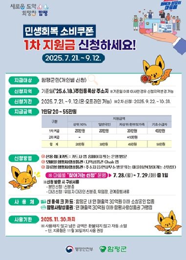 또한, 함평군은 ‘2차 민생회복 소비쿠폰’ 지급 기간에도 ‘찾아가는 신청 접수’ 기간을 운영해 현장 중심의 촘촘한 행정을 이어갈 방침이다.