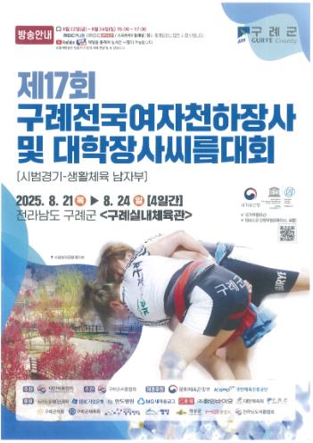 [무한뉴스=정민정 기자] 전남 구례군은 오는 8월 21일부터 24일까지 4일간 구례실내체육관에서 ‘제17회 구례전국여자천하장사 및 대학장사씨름대회’를 개최한다.