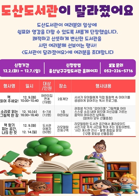 [무한뉴스=최진수 기자] 울산 남구 도산도서관은 부분 리모델링을 통해 한층 더 쾌적하고 편안한 독서환경을 조성하고 시민들이 책과 문화를 함께 즐길 수 있는 열린 공간으로 거듭나 이를 기념하는 ‘도산도서관이 달라졌어요’ 행사를 9일부터 14일까지 운영한다고 밝혔다.