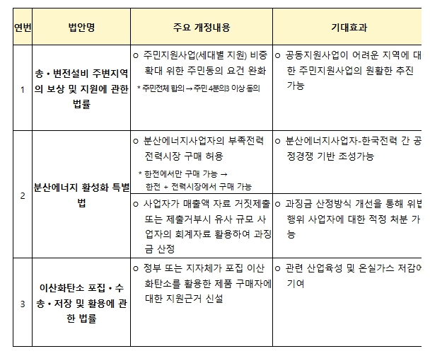 [무한뉴스=양현명 기자] 기후에너지환경부는 △‘송‧변전설비 주변지역의 보상 및 지원에 관한 법률’, △‘분산에너지 활성화 특별법’ 등 3개 법 개정안이 11월 13일 국회 본회의를 통과했다고 밝혔다. 개정안별 주요내용은 다음과 같다.