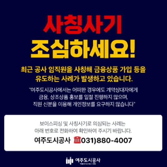 여주도시공사는 앞으로도 관련 피해 신고 채널 안내, 사칭 사례 대외 공지, 협력업체 맞춤형 예방 교육 등 사전 대응 활동을 지속할 계획이다.