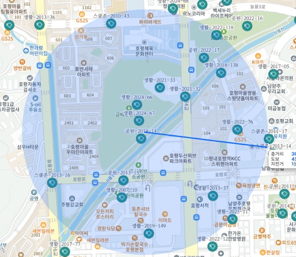 | ▲ 호평동 금배근린공원 반경 300m 이내 CCTV 설치 현황 |
