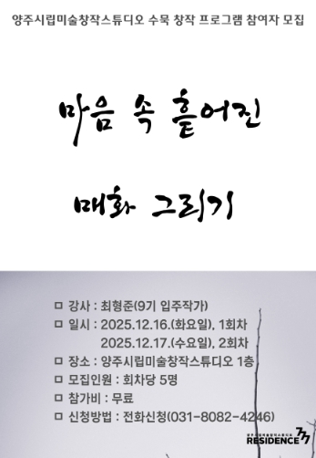 [무한뉴스=정승훈 기자] 양주시립미술관이 오는 12월 17일과 18일 이틀간, 양주시립미술창작스튜디오 9기 입주작가 최형준이 진행하는 창작 수묵화 프로그램 《마음 속 흩어진 매화 그리기》의 참여자를 모집한다.