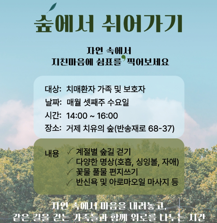 ‘숲에서 쉬어가기’는 5월부터 매월 셋째주 수요일, 오후 2시부터 4시까지 거제 치유의 숲에서 진행되며, 돌봄으로 지친 가족들이 자연 속에서 잠시나마 여유를 느끼고 자신을 돌볼 수 있도록 돕는 치유 프로그램이다.