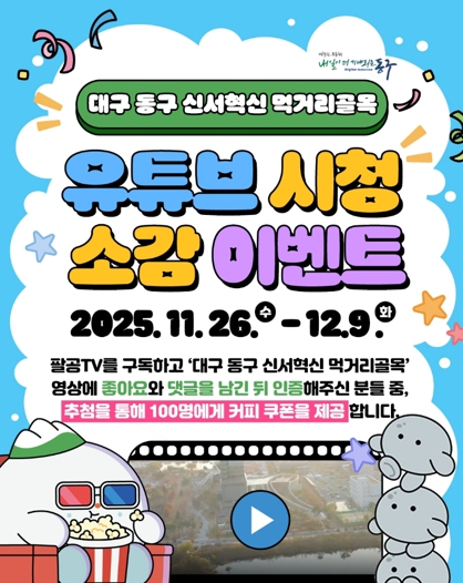 이달 26일부터 12월 9일까지 진행되는 ‘홍보영상 유튜브 시청 이벤트’는 동구청 유튜브에서 ‘신서혁신 먹거리골목 홍보 영상’을 시청하고 감상평을 남긴 후 이벤트 참여 사이트를 통해 응모 가능하다.