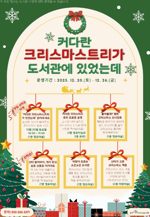 [무한뉴스=최진수 기자] 울산 남구 옥현어린이도서관은 연말 크리스마스를 맞아 20일부터 26일까지 어린이와 가족이 함께 즐길 수 있는 독서문화행사 ‘커다란 크리스마스트리가 도서관에 있었는데’를 운영한다.