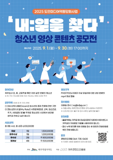 [무한뉴스=정민정 기자] q 제주특별자치도와 제주콘텐츠진흥원(원장 강민부)은 제주 청소년들이 영상 콘텐츠를 통해 자신의 꿈과 목소리를 자유롭게 표현하는 ‘내:일을 찾다, 청소년 영상 콘텐츠 공모전’을 추진한다.
