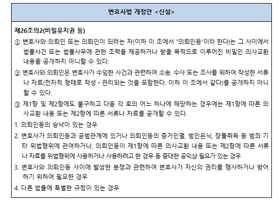 개정안은 ‘변호사와 의뢰인이 주고받은 법률상담 내용’이나, ‘변호사가 작성한 의견서’ 등을 비밀유지권으로 보호하고, ‘의뢰인이 공개에 동의한 경우’, ‘범죄와 관련되어 있는 경우’ 등 비밀유지권이 인정되지 않는 예외 사유를 규정하는 것을 주요 내용으로 한다.