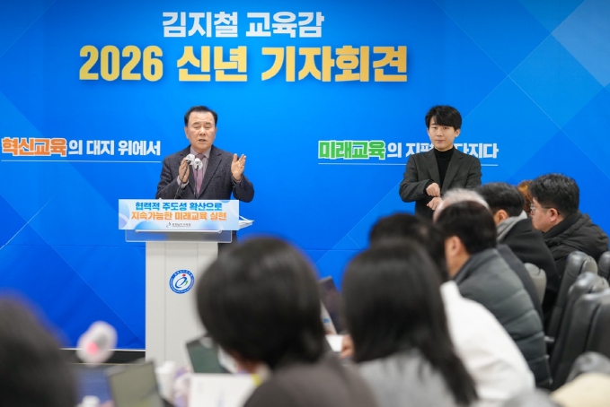 [무한뉴스=정승훈 기자] 김지철 충남교육감은 8일, 도교육청 회의실에서 ‘2026 신년 기자회견’을 열고, ‘2025년 주요 성과와 2026년 12대 중점 추진 과제’를 발표했다.