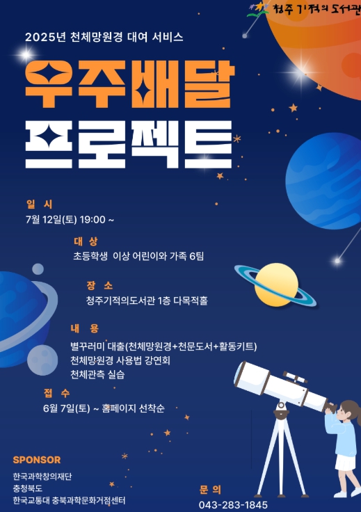 [무한뉴스=정민정 기자] 청주시립도서관 소속 청주기적의도서관은 오는 7월부터 11월까지 총 8차시에 걸쳐 초등학생을 둔 가족을 대상으로 천체망원경 대여 서비스 ‘우주배달 프로젝트’를 운영한다.