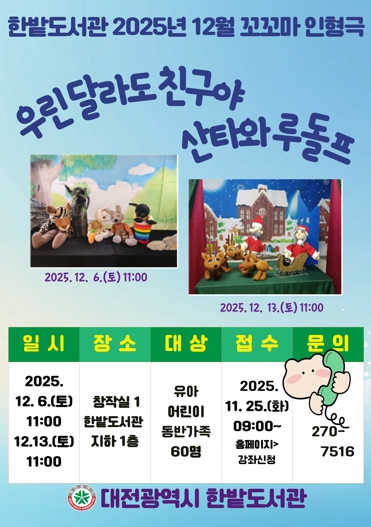 [무한뉴스=정민정 기자] 한밭도서관은 지역 어린이들에게 따뜻한 감성과 사회적 가치를 전하기 위해 두 가지 인형극 ‘우린 달라도 친구야’, ‘산타와 루돌프’를 공연한다.