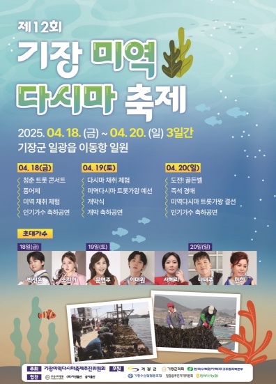 [무한뉴스=최진수 기자] 기장군은 오는 18일부터 20일까지 일광읍 이동항 일원에서 기장미역다시마축제추진위원회 주관으로 ‘제12회 기장미역다시마축제’를 개최한다고 11일 밝혔다.