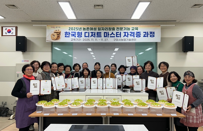 [무한뉴스=최진수 기자] 구미시는 농촌여성의 경제활동 참여 확대와 일자리 창출을 목표로 올해 상·하반기 전문기능교육을 운영해 ‘노인실버건강지도사’와 ‘한국형 디저트 마스터’ 2개 자격증 과정을 성공적으로 마무리했다.