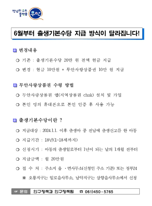 무안군은 6월부터 출생기본수당을 기존 현금 20만원에서 ‘현금 10만원+ 무안사랑상품권 10만원’으로 변경 지급해 출산가정을 지원함과 동시에 지역경제 활성화를 동시에 도모한다.