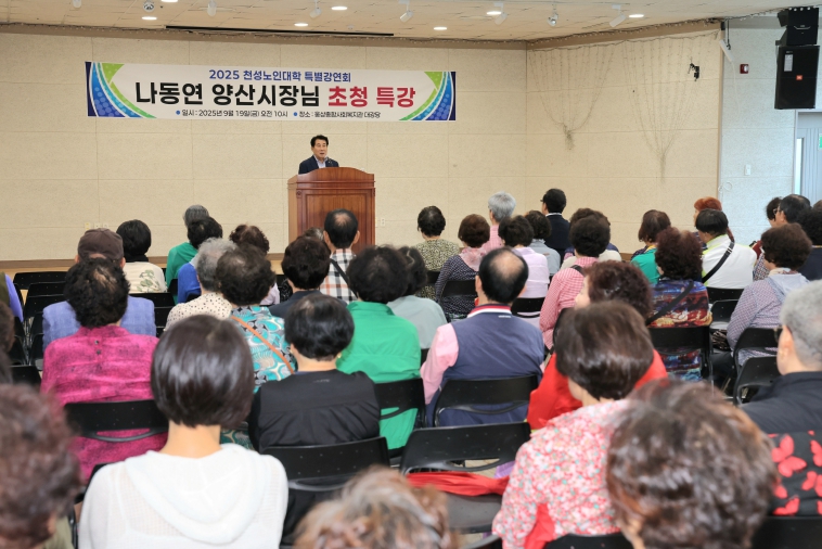 [무한뉴스=최진수 기자] 양산시는 노인대학인 천성노인교실(학장 전인배)에서 19일 나동연 양산시장을 초청해 수강생 180명을 대상으로 특별강연을 진행했다고 밝혔다.