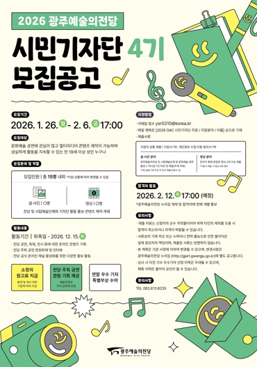 [무한뉴스=정민정 기자] 광주광역시 예술의전당은 전당의 다양한 공연 정보와 문화 소식을 직접 취재하고 공식 온라인 채널을 통해 알릴 ‘2026 광주예술의전당 시민기자단 4기’를 26일부터 2월6일까지 모집한다.