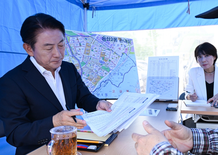 송산2동 주민센터 앞 야외 주차장에서 진행된 현장시장실에는 10여 명의 시민들이 참석했다. 상담에 앞서 김동근 의정부시장은 현장시장실에 찾아온 시민들에게 송산2동의 주요 현황에 대해 설명한 후 시민들과 1:1 상담을 진행했다.