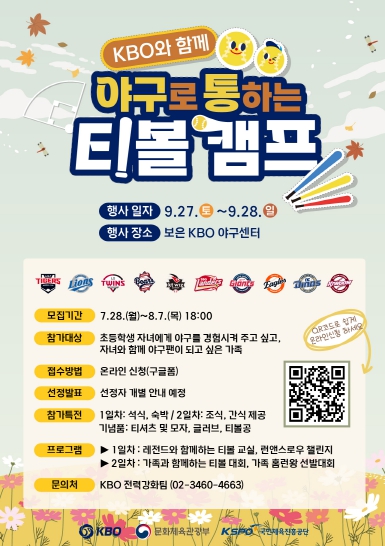 [무한뉴스=최진수 기자] KBO는 ‘2025 제2차 야구로 통하는 티볼캠프’에 참가할 가족을 오늘(28일)부터 8월 7일(목) 오후 6시까지 모집한다.
