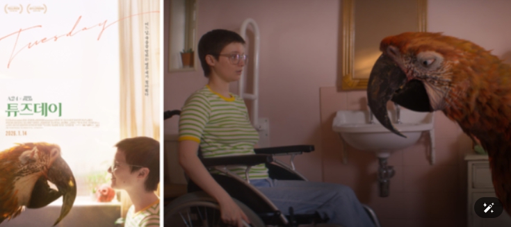 먼저 삶과 죽음에 관한 독특한 시선을 담은 영화 '튜즈데이'는 불치병에 걸린 ‘튜즈데이’와 점점 다가오는 딸의 죽음을 거부하는 엄마 ‘조라’ 앞에 모든 죽어가는 존재의 마지막 순간을 배웅하는 앵무새 ‘죽음’이 나타나며 벌어지는 A24 X BBC FILM의 독특한 휴먼 감동 판타지이다.