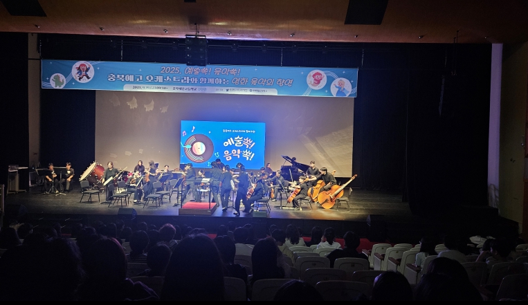 첫 순서인 ‘영화음악과 함께하는 오케스트라 향연’에서는 LED 영상과 해설이 더해진 음악회가 펼쳐지고, 충북예술고 오케스트라와 전문 연주자 6명이 함께 무대에 올라 학생들에게 생생한 공연을 선사했다. 이어지는 ‘음악공간 탐방과 체험’에서는 음악, 미술, 무용 공연실과 작업실을 둘러보고 예술 키링 만들기 체험을 진행했다.