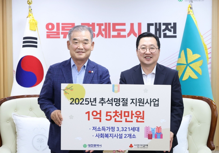 [무한뉴스=정민정 기자] 대전시는 9월 22일 시청에서 대전사회복지공동모금회로부터 추석 명절을 맞아 저소득가정을 돕기 위한 성금 1억 5천만 원을 기탁받았다. 이날 행사에는 유재욱 대전사회복지공동모금회 회장이 참석해 이장우 대전시장에게 성금을 전달했다. 시는 기탁금 중 1억3,500만 원을 저소득 3,321가구에 현금으로 지원하고, 나머지 1,500만 원은 쪽방상담소와 이주외국인종합복지관의 명절맞이 행사에 사용할 계획이다.