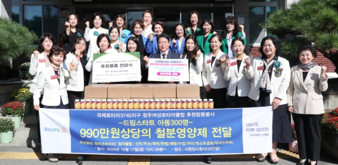 [무한뉴스=정민정 기자] 청주시 국제로타리3740지구 소속 9개 여성로타리클럽은 17일 청주시청을 찾아 성장기인 취약계층 아동(드림스타트)을 위해 영양제를 기탁했다.