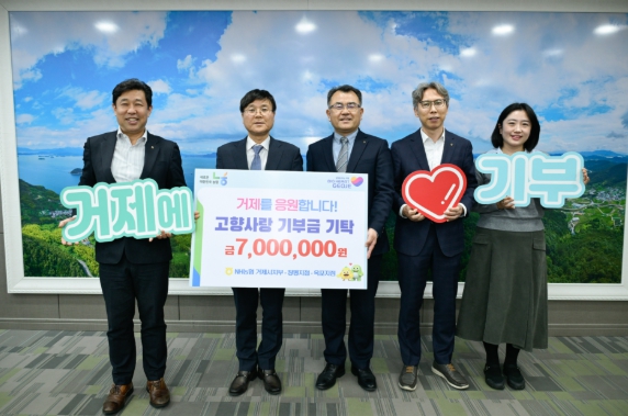 거제시청 시장실에서 14일 열린 전달식에는 변광용 거제시장을 비롯해 권경화 NH농협은행 거제시지부장, 이동언 회원지원단장, 김성훈 거제시청출장소지점장, 윤외준 장평지점장이 참석했다. 이들은 임직원들을 대표해 고향사랑기부금 700만원을 기탁했다.