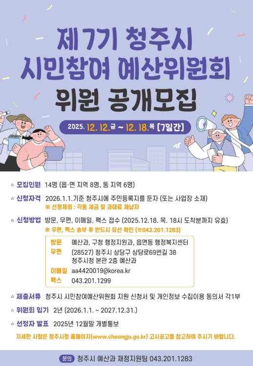 [무한뉴스=정민정 기자] 청주시는 시민참여예산제의 효율적인 운영과 활성화를 위해 오는 18일까지 제7기 청주시 시민참여예산위원 14명을 공개모집한다.