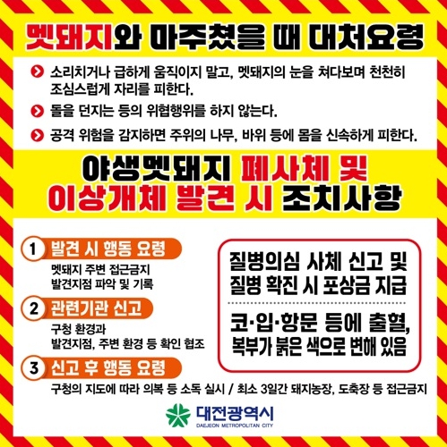 하지만 예기치 않게 멧돼지를 마주칠 경우를 대비해 시민 스스로 대처법을 숙지하는 것이 중요하다고 강조했다. 대전시가 안내하는 주요 행동요령은 다음과 같다.