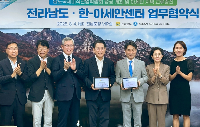 [무한뉴스=정민정 기자] 전라남도는 4일 도청 접견실에서 한-아세안센터와 함께 2025 남도국제미식산업박람회의 성공 개최와 아세안 지역 교류 증진을 위한 업무협약(MOU)을 했다.