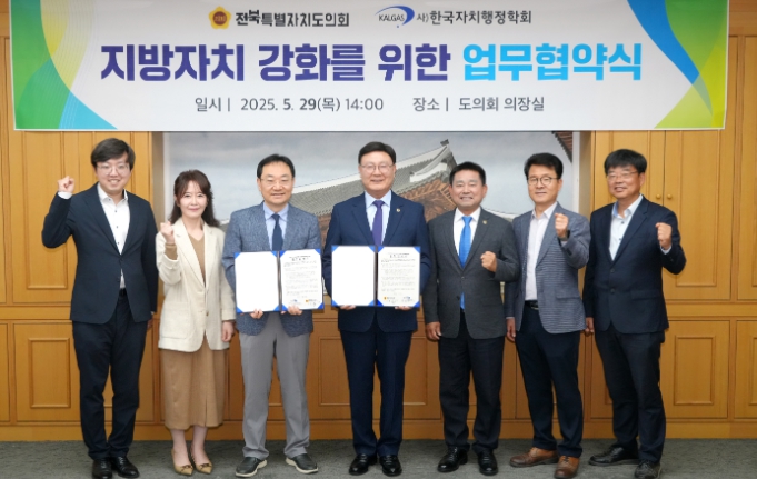 [무한뉴스=정민정 기자] 전북특별자치도의회는 29일 도의회 의장실에서 (사)한국자치행정학회와 지방자치 강화 및 지역현안 해결을 위한 업무협약을 체결했다고 밝혔다.