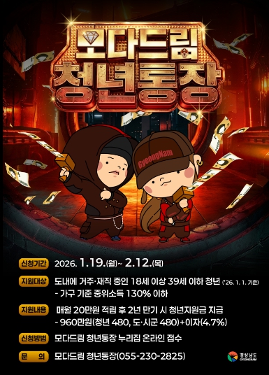 [무한뉴스=최진수 기자] 거제시은 청년들의 자산 형성을 지원해 경제적 자립 기반을 마련하고 장기 재직과 지역 정착을 유도하기 위해 '2026년 모다드림 청년통장 지원사업'상반기 참여자(43명)를 1월 19일부터 2월 12일까지 모집한다.