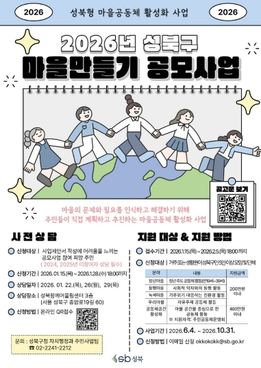 [무한뉴스=정승훈 기자] 서울시 성북구는 마을공동체 활성화를 위해 '2026년 성북구 마을만들기 공모사업'을 진행한다.