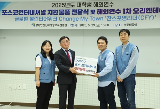 [무한뉴스=정승훈 기자] (재)인천인재평생교육진흥원은 지난 23일, 포스코인터내셔널로부터 대학생 해외연수 장학생을 위한 250만 원 상당의 후원 물품을 전달받았다고 밝혔다.
