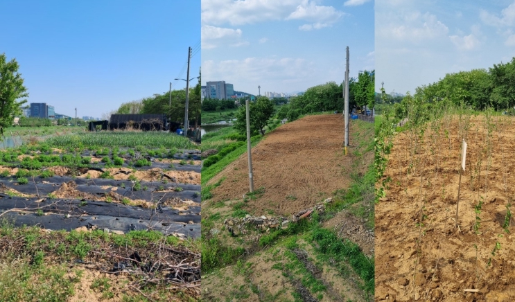 | ▲ 석수동 충훈대교 인근 시유지 복원 사진(왼쪽부터 철거전_철거후_무궁화 식재후) |