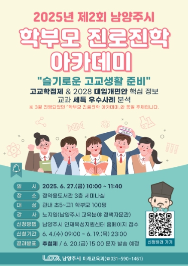 [무한뉴스=정승훈 기자] 남양주시는 6월 27일 정약용도서관에서 개최되는 ‘제2회 학부모 진로진학 아카데미’ 참여자를 내달 4일부터 모집한다고 밝혔다.